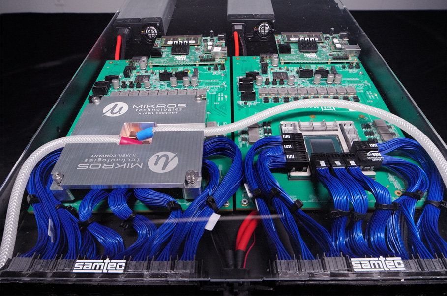 This Marvell board has two XPUs connected by Si-Fly ® co-packaged copper cable arrays from Samtec (blue) and a custom liquid cooled solution from Mikros Technologies (on the left).