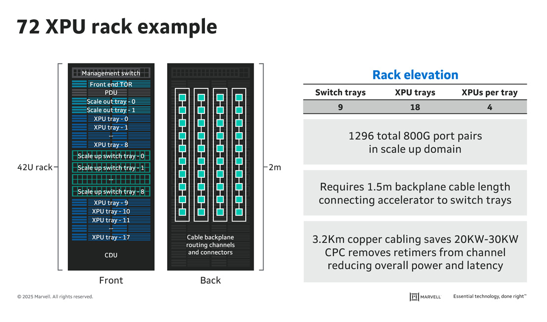 A standard 72-XPU rack contains ~1,300 connections. A complete row, which usually contains ten racks, would have 13,000 connections that would collectively run for 30 kilometers and need 200-300kW. (Marvell estimates from industry averages)