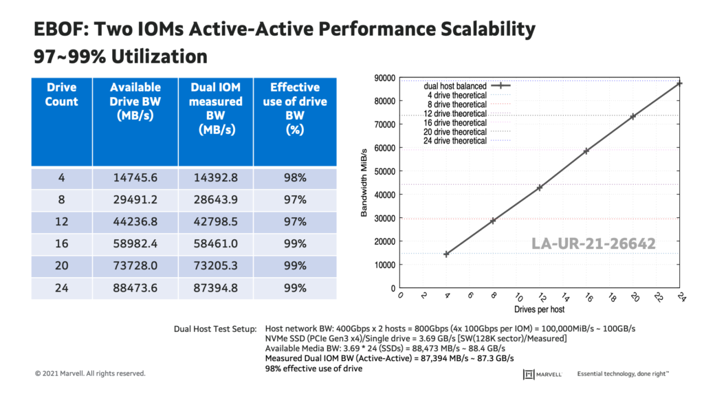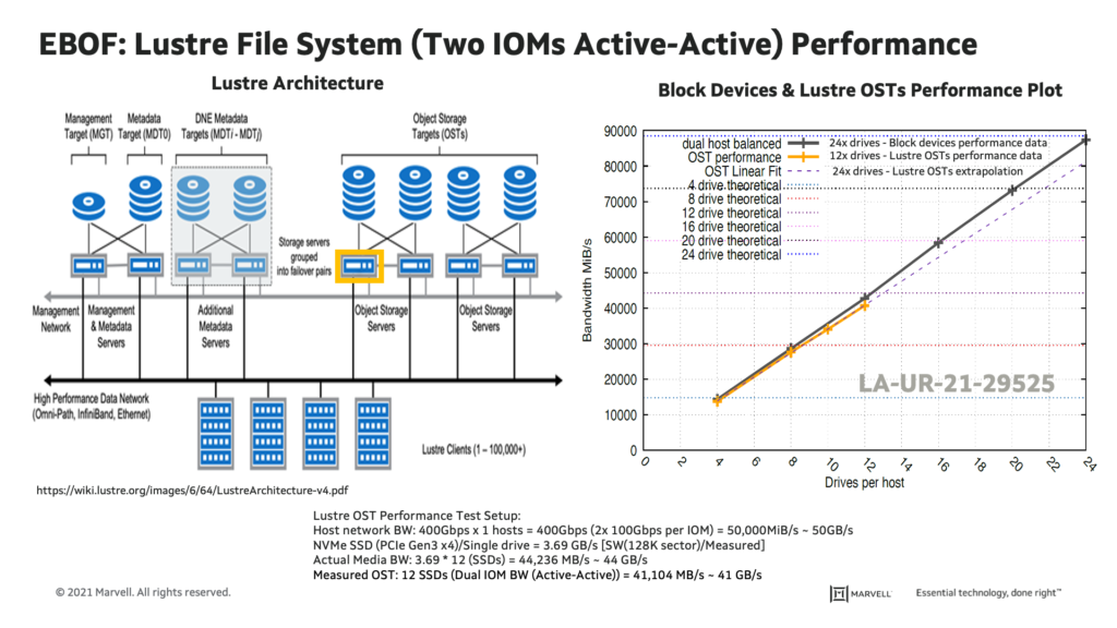 Marvell proudly collaborated with LANL on the high-availability (HA) and Lustre file system performance benchmark using Foxconn Irene EBOF. Results shows that 98% and 95% of bandwidth utilization of NVMe SSDs for high availability (HA) configuration and Lustre, respectively. EBOF enables scalability, flexibility, and better utilization of NVMe SSDs and exposes the full bandwidth of each NVMe SSD linearly on a system-level benchmark which is required for hyperscale data centers in a disaggregated deployment. Marvell and LANL continue to explore other real-world application use cases which take can advantage of EBOF like AI/ML, CDI, and HPC workloads and we look forward to reporting out on additional benchmark results as they are generated. Stay tuned!