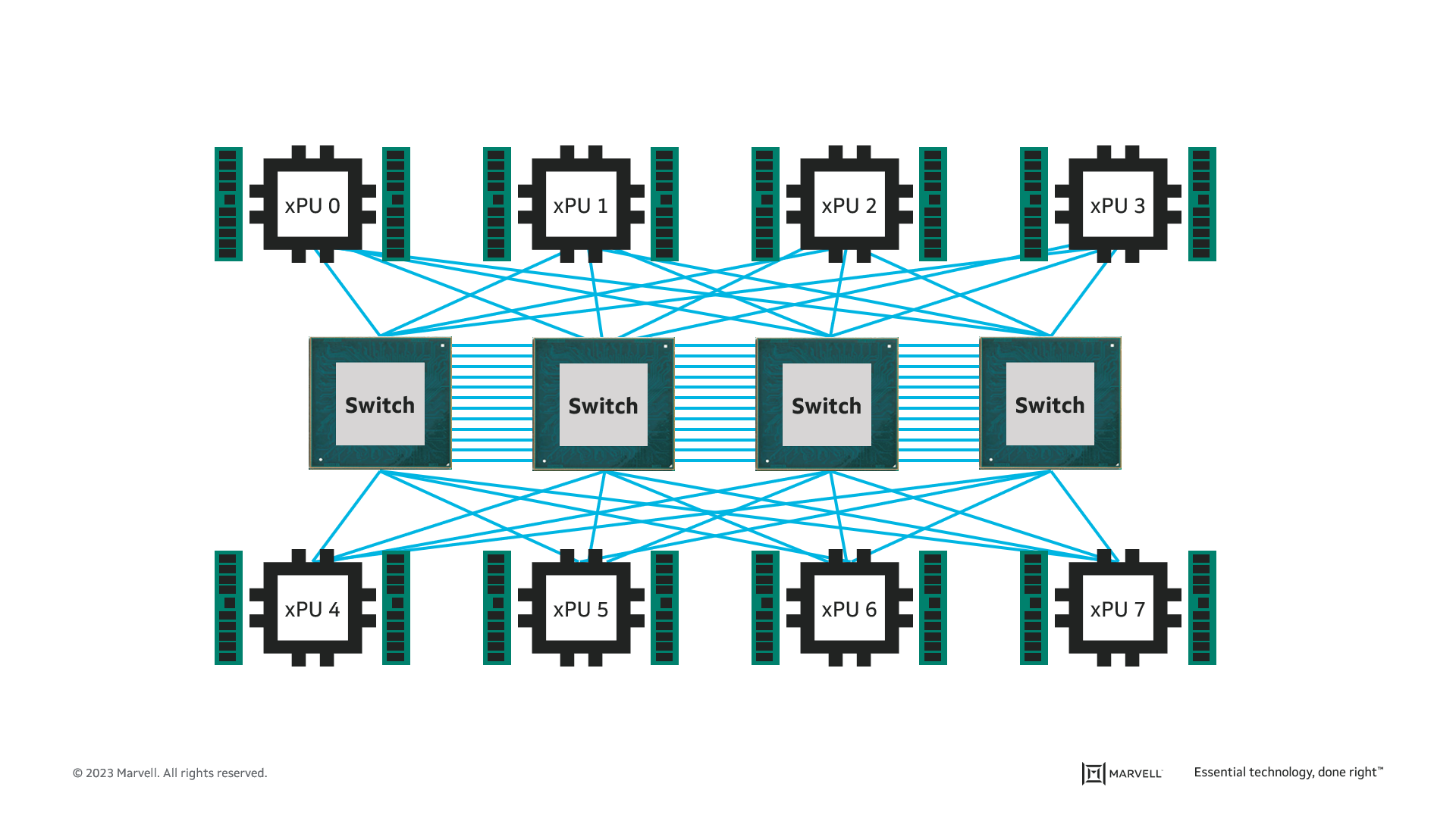 Having established the distinctive architecture of AI platforms compared to traditional compute platforms, it is also important to note AI platforms’ massive bandwidth requirements. For instance, each xPU or AI accelerator used in the example AI platform has 3.6Tbps of networking bandwidth resulting in a total bandwidth of nearly 30Tbps per server. In comparison, today’s typical cloud compute server has an average networking bandwidth of 100Gbps. This represents a 300X multiple of bandwidth capacity as compared to today’s typical cloud compute server.