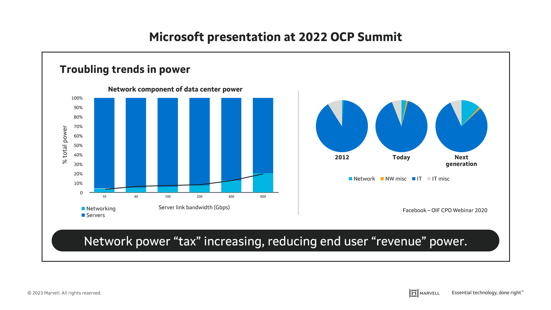 This is a problem for operators, as suggested at the bottom of the figure. Why? Because whereas networking does not always generate revenue, computing does. Power consumed by networking is power that would otherwise be available for revenue-generating servers and the applications that run on them. As described in Google’s keynote at OCP Summit in October 2022, a new class of custom silicon is needed to achieve improved networking power and cost efficiencies.